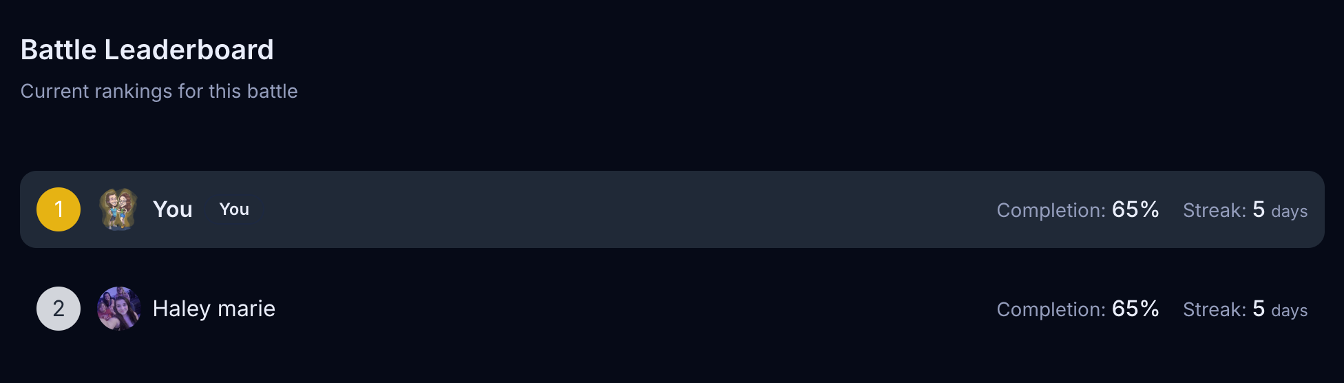- View statistics like longest streaks, highest completion rates, and most battles won